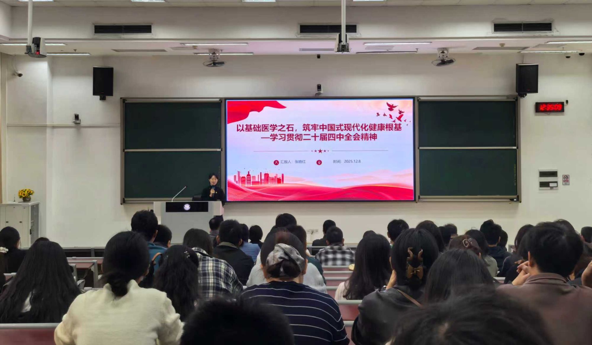 党委举行学习贯彻党的二十届四中全会精神专题辅导报告会,邀请学校党委宣讲组成员张晓红副教授作辅导报告。报告会由学院党委书记尹梅主持,全体师生党员参加。