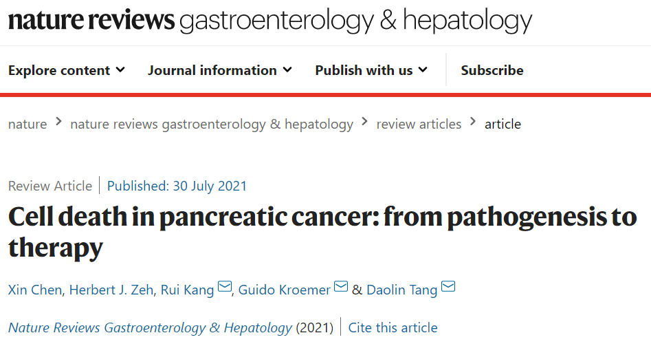 广东省高校蛋白质修饰与降解重点实验室成员陈鑫博士,以第一作者身份在Nature Reviews Gastroenterology & Hepatology(IF: 46.802)期刊发表题为“Cell death in pancreatic cancer: from pathogenesis to therapy”综述。该文首先介绍了调节性细胞死亡(细胞凋亡,坏死性凋亡,细胞焦亡,铁死亡和碱死亡)的关键分子机制,总结了胰腺癌细胞中七大信号通路(TP53,KRAS,TGFβ,缺氧,代谢,自噬和热休克反应)对调节性细胞死亡的调控机制,并概括了调节性细胞死亡在胰腺癌发生发展中的双向调节(促肿瘤或抑肿瘤)作用,最后讨论了调节性细胞死亡在胰腺癌治疗(化疗,放疗,免疫治疗等)中的作用。总体上,该综述描述了胰腺癌细胞中致死信号的复杂性和多面性,强调了激活细胞死亡途径实现胰腺癌的精准治疗的挑战和机遇。