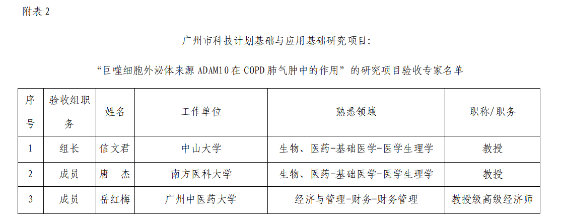 2.广州市科技计划基础与应用基础研究项目: “巨噬细胞外泌体来源ADAM10在COPD肺气肿中的作用”的研究项目验收专家名单