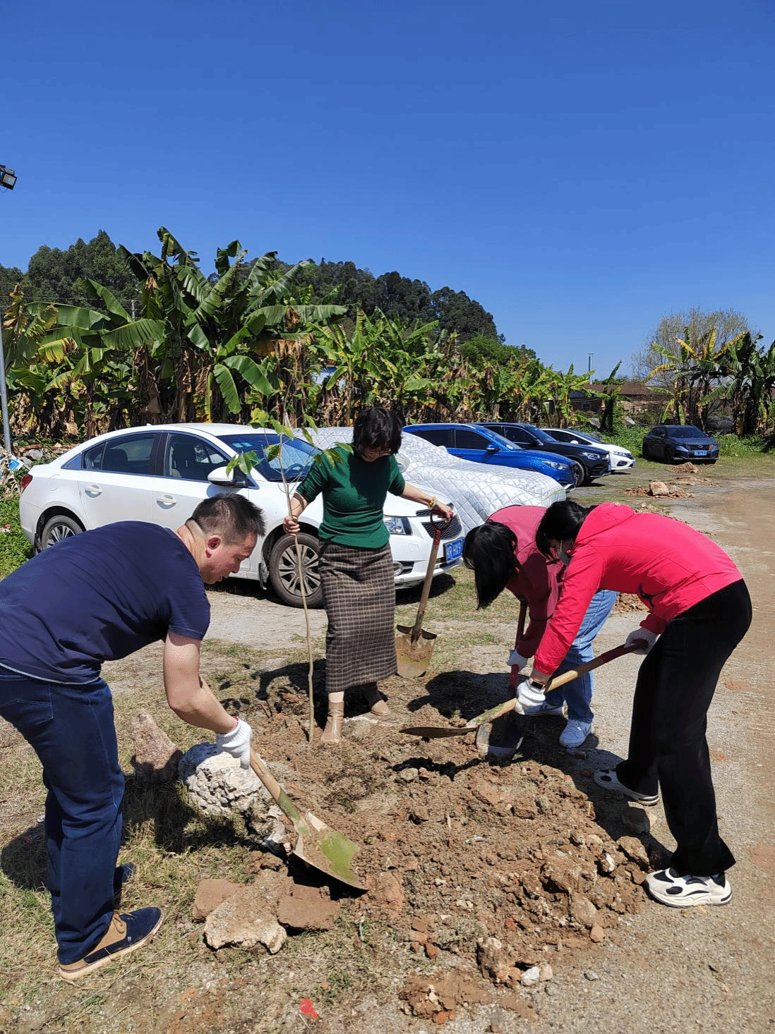 活动现场,大家三五人一组,干劲十足,在炙热的阳光下挥洒汗水。挥锹铲土、扶树填坑、培土加固……大家默契配合,经过一番辛勤劳作,80多株沉香树苗、紫荆树迎风挺立,展现出蓬勃生机,带来了浓浓绿意。