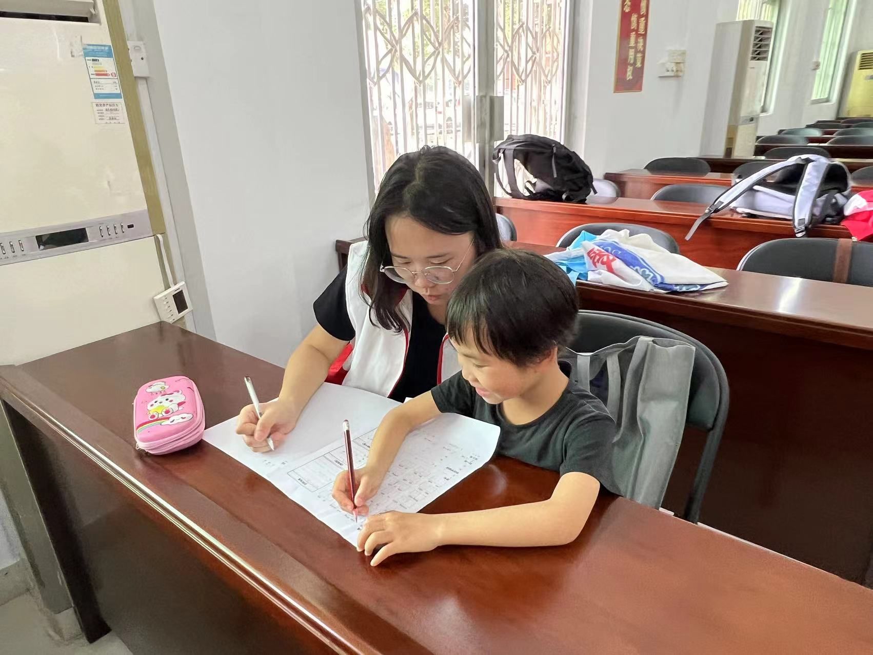 活动中,小朋友们将不懂的知识点和作业向志愿者请教,志愿者们发挥各自所长,一一耐心详细解惑。每组的志愿者和小朋友都十分投入。