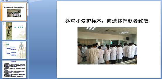 挖掘人体解剖学课程的思政教育元素,使思政教育融入课堂教学,努力培养一批符合社会主义事业需要、德才兼备的医学生。注重医文相融,线上课程内容与人文素质教育有机结合,注重医学生的人文素养以及价值观、人生观培养。如在课程线上教学时,适当融入对大体标本、遗体捐献者这些大体良师的致敬与默哀环节,引导同学们学会尊重大体良师、懂得奉献和感恩社会。同时,结合当前抗击疫情中有不幸感染新冠去世的医务人员和市民志愿捐献遗体用于医学研究的事迹,同学们纷纷表示对此行为的赞同和认可,并表达了对他们的尊重和感恩之心,也激发了同学们立志为祖国医疗事业发展而努力奋斗的社会责任感和爱国情怀。