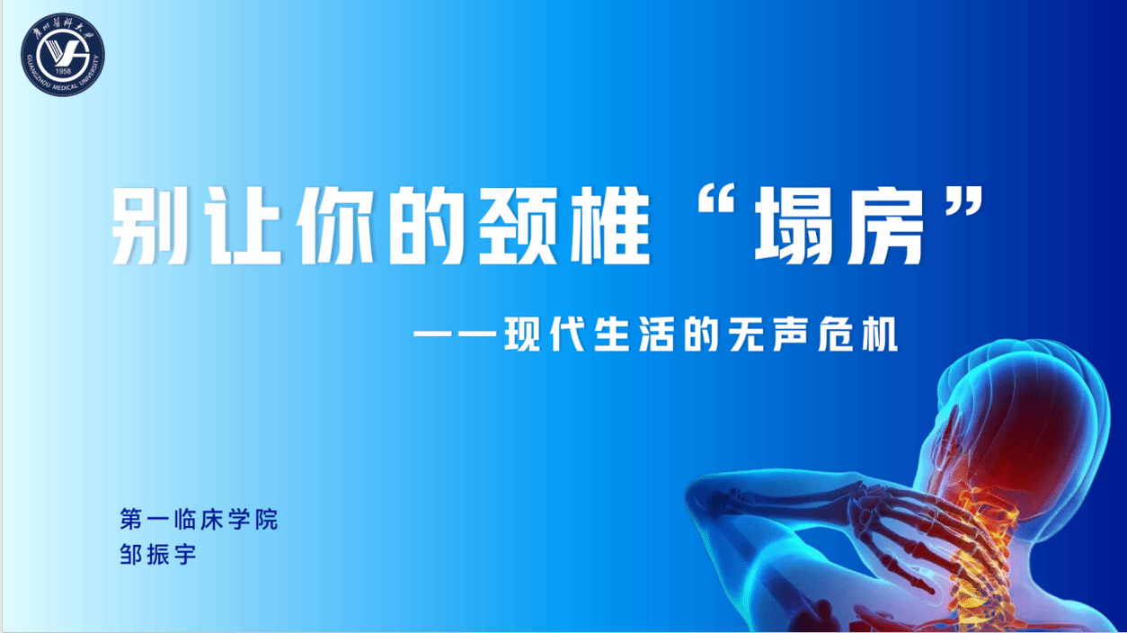▶内容简介:我国颈椎病的发病率约为10-20%,且近年来有年轻化的趋势。每天刷手机、低头打字、伏案工作……这些表面上看似小毛病,实则可能是颈椎病在“偷偷找上门”!本次讲解围绕“颈椎病”这一现代人普遍存在却易被忽视的健康问题展开。从“为什么低头会伤颈椎”到“如何判断自己的颈椎是否健康”,再到“用科学的方法保护颈椎、缓解症状”,讲解设计循序渐进,通过互动式提问、小测试和现场演示将专业知识与生活场景巧妙结合。颈椎健康不仅关系到我们的脖子,它还牵动着神经系统、血液循环,影响整个人的精神状态与生活质量,大家别再忽视那些“咔咔响”“发僵”“麻木”的信号,让我们一起开启一场“颈椎保卫战”,从“头”开始,守护健康!