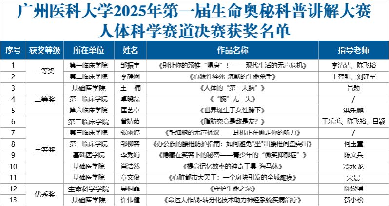 由中山大学、广州市科协等多领域专家组成的评审团,从科学严谨性、表达感染力和舞台表现力等维度进行综合评定。最终,经过激烈角逐,大赛诞生了13位获奖选手,其中一等奖2名、二等奖3名、三等奖6名、优秀奖2名。