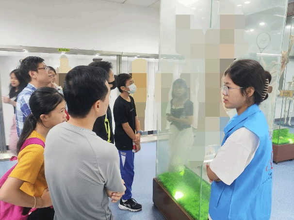 讲座结束后,工作人员按照安排将到访者分为4个小组,分流进行讲解和参观。在标本馆中,科普人员向到访者讲解人体结构和科普快乐激素对人体的作用,并分配时间让到访者自行参观标本馆。通过参观,到访者更直观地了解人体结构知识和人体标本对现代医学事业发展的重要意义。在纪念馆中,科普人员通过讲解让到访者更深切地感受到遗体捐献志愿者感人故事中蕴含的伟大精神,到访者纷纷对纪念馆中的遗体捐献志愿者表示尊重和敬佩。在人体标本馆科普基地一楼,两位讲解员耐心讲解心肺复苏的知识,规范展示心肺复苏的动作并协助到访者亲身进行心肺复苏的实操,到访者对此表示受益匪浅。