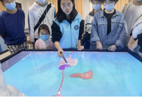 (市民佩戴3D眼镜观摩立体器官) (工作人员讲解消化系统组成)