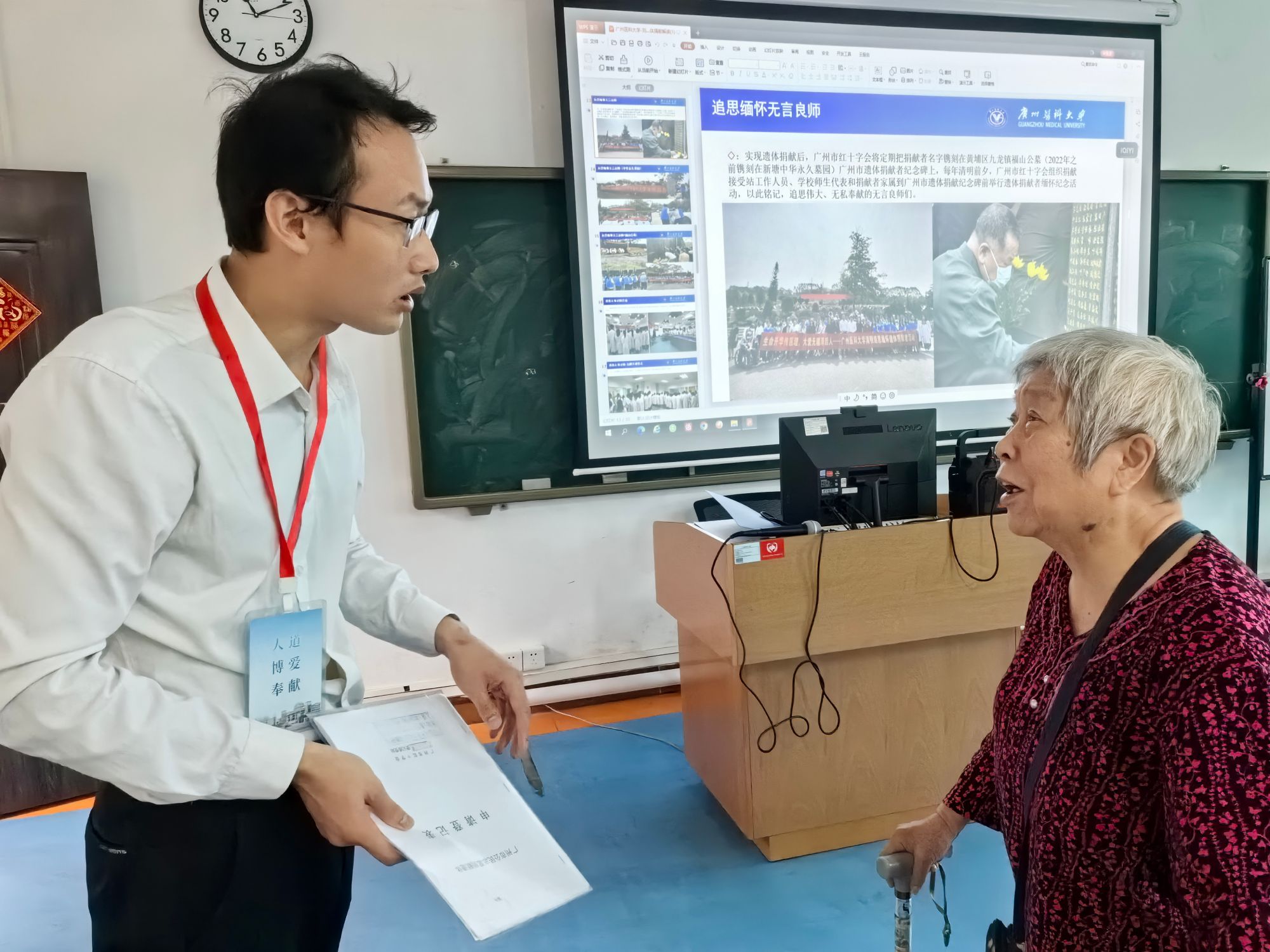 在交谈中,朱姨提及自己曾是一名护士,其丈夫徐执提是一名海军少将,曾任海军指挥学院副院长。他们深知大体老师对医学教育的重要性,因此,早在2018年,俩夫妇便在南京市红十字会办理了遗体捐献登记手续。2023年1月,徐执提将军不幸离世,并将遗体捐献给南京市红十字会南京大学医学院。徐执提将军逝世后,朱姨搬到广州和女儿同住,她联系了广州市红十字会,随即在广州医科大学遗体捐献登记接受站办理了遗体捐献登记手续。
