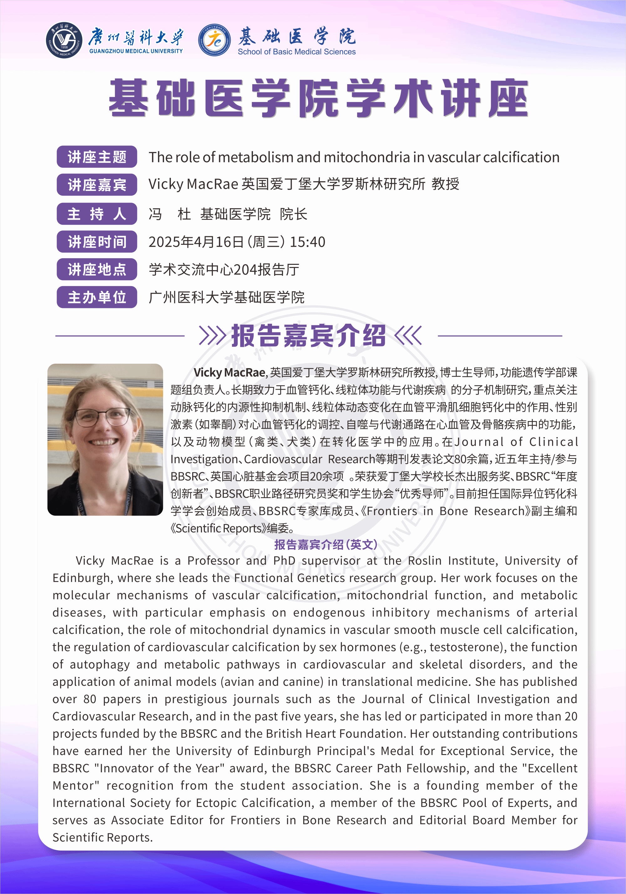 ◾讲座嘉宾:Vicky MacRae 教授,英国爱丁堡大学罗斯林研究所