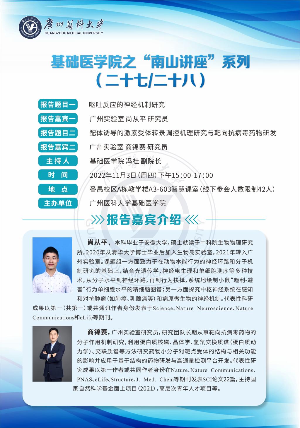 学术讲座--呕吐反应的神经机制研究&配体诱导的激素受体转录调控机理研究与靶向抗病毒药物研发