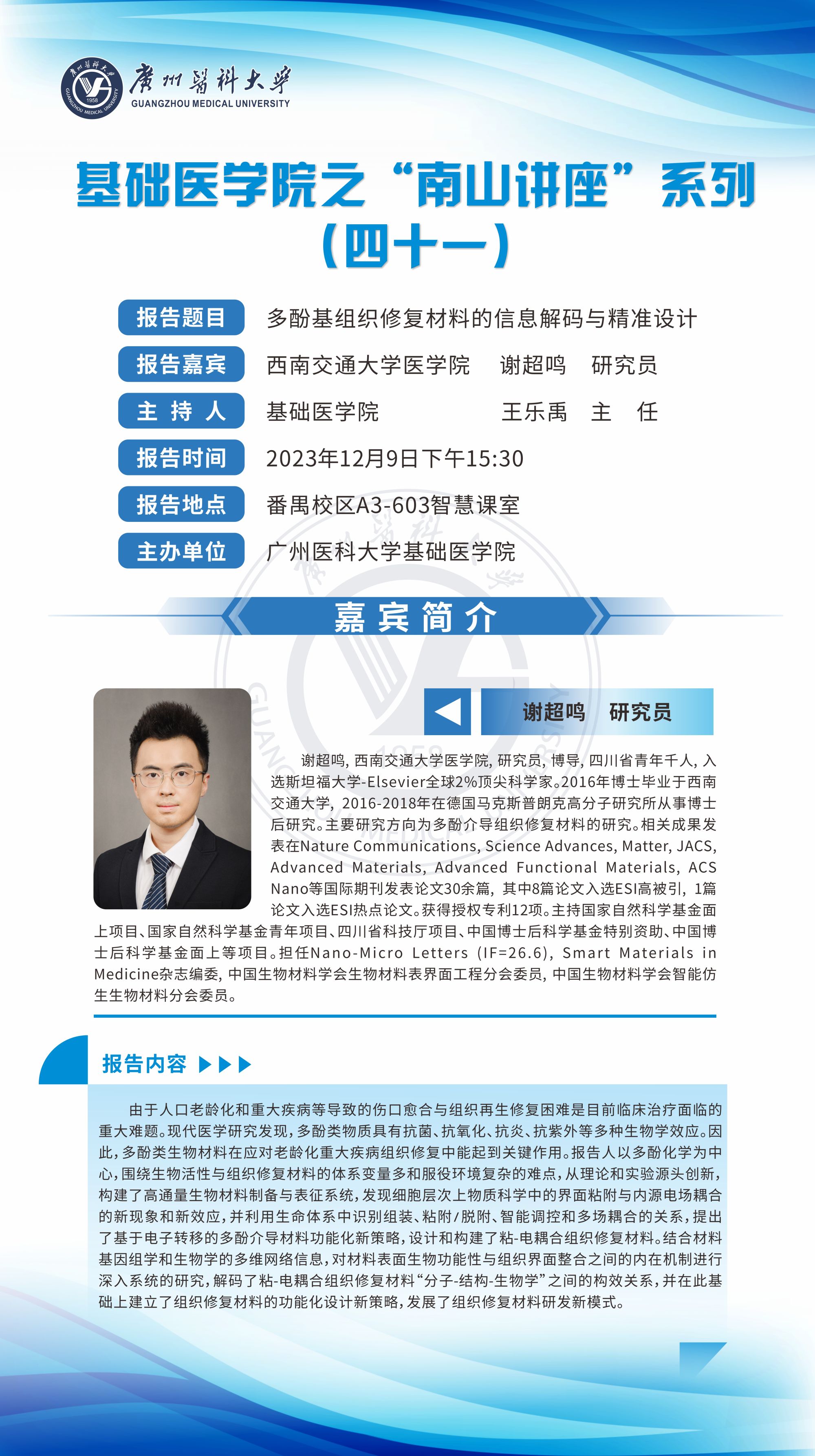 学术讲座--多酚基组织修复材料的信息解码与精准设计